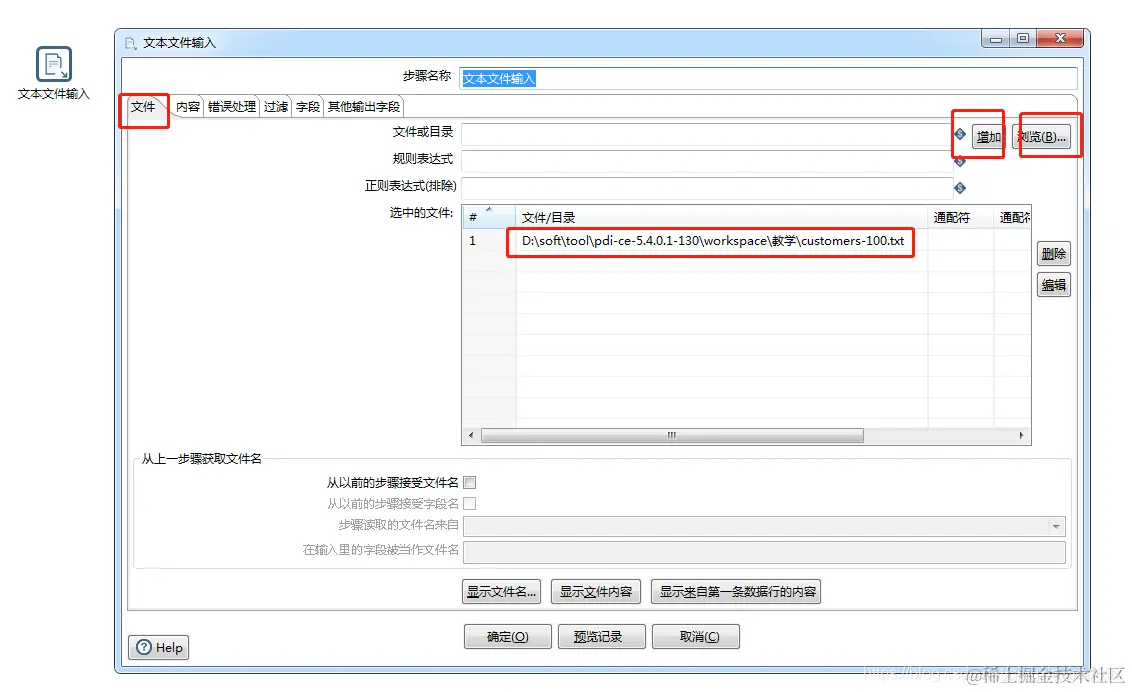 第二步:双击“文本文件输入”节点,进行配置,在“文件”选项卡中:1,点击浏览按钮选择本地txt文件;2,点击增加;