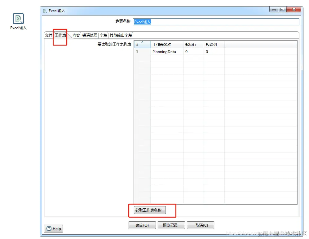 第三步:在“工作表”选项卡,点击“获取工作表”按钮。(其实获取的就是sheet页的名称)如下图: