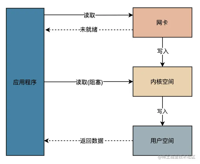 等到 Java 1.4 版本以后就支持了 NIO,其实 NIO 解决的地方是从网卡到内核空间部分的阻塞,也就是说应用程序发送一个读取 IO 的请求,如果数据还没有从网卡写入内核空间,直接返回未就绪,这样就做到了不需要程序死等到结果。等到写入内核空间以后,程序继续读取数据,这时候才会阻塞程序,如下图。