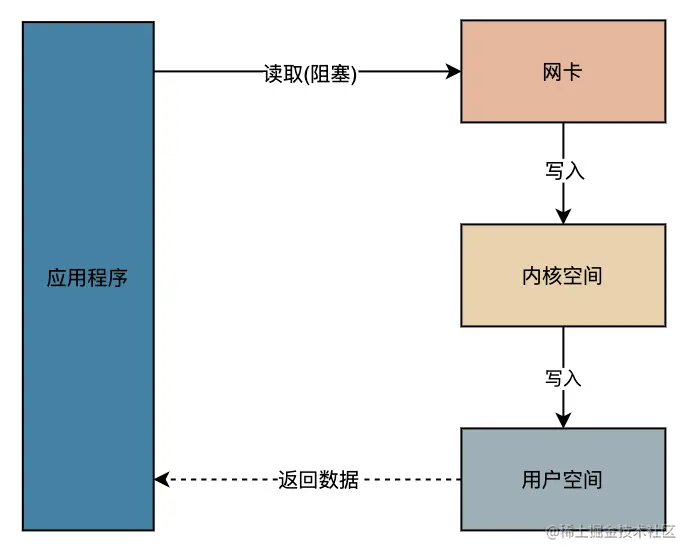我们换一个调用链路图说明一下阻塞的位置,第一张图解释的是 BIO,也就是同步阻塞 IO,Java 最早期的版本的 IO 就是这样实现的。当程序调用到读取IO的时候,同步阻塞住程序,直到数据从网卡写入内核空间,再写入用户空间才返回数据,程序才可以继续运行。