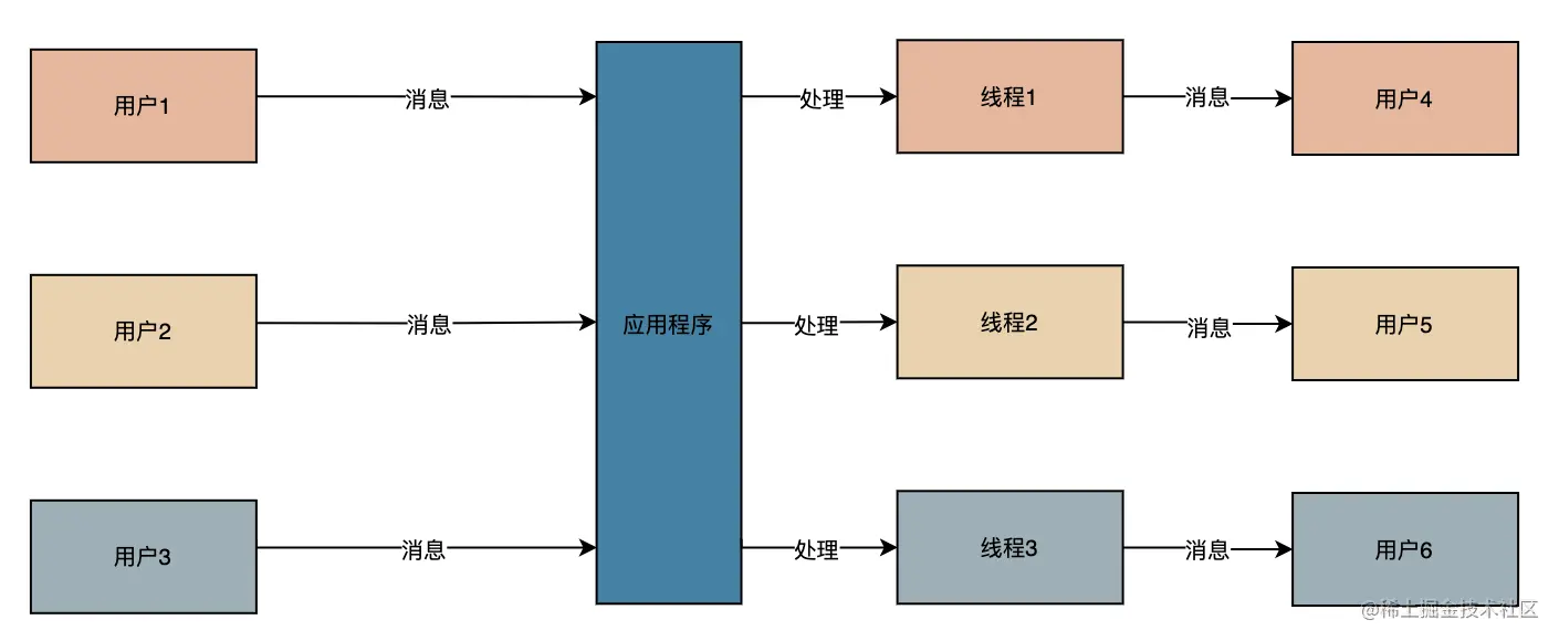 我们需要为每一个请求用户创建一个新的线程,才能同时支持多个用户同时使用,然鹅,随着用户越来越多,需要创建的线程也越来越多,频繁的上下文切换和线程的创建和销毁,对于系统性能影响非常大,具体的链路可以通过下面的图理解下。