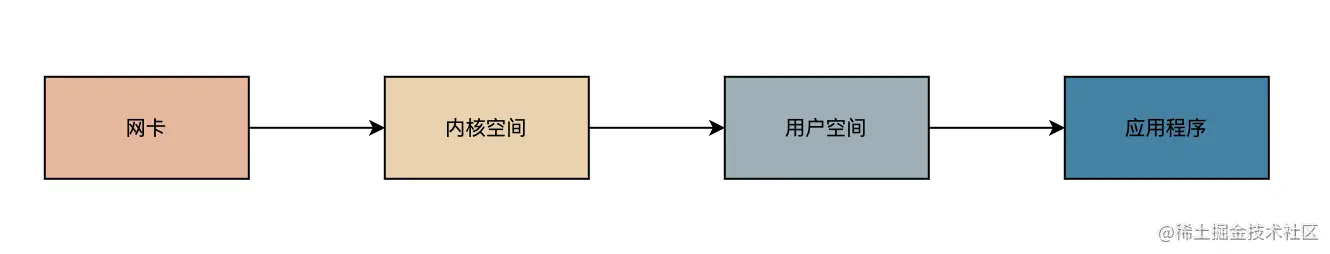 下面是一次网络内容读取的 I/O 示意图,数据从外设(网卡)到内核空间,到用户空间(JVM)最后到应用程序的一个过程,那么阻塞和非阻塞指的是哪里呢?