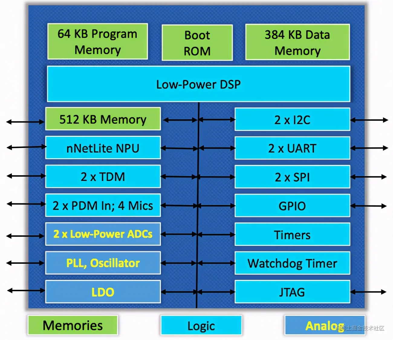 该SoC的外形尺寸很小,只有4平方毫米,可以进入像智能手表这样的极小设备。同样,在SoC的神经网络nNetLite引擎上运行的始终处于开启状态的wake word算法只消耗几微瓦的电能。