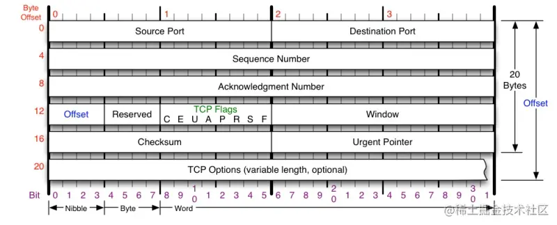 TCP 其实是非常复杂的协议,我们先聊一些基础的。我们知道 TCP 是一种可靠的协议,它主要通过解决这几个问题来实现可靠性的,分别是:乱序、丢包重传、流控、拥塞控制。通过从图中报文格式的字段,也能够简单了解到 TCP 的相关概念。