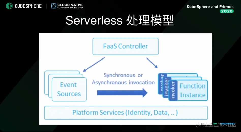 下图是 Serverless 的处理模型。上文讲到,它的模式是事件触发,所以它会有事件源产生事件,然后 FaaS 的 controller 是根据这些事件去启动 function 的 instance,而且能够实时的去扩展,能够 scale 到 0,这样动态的去给用户提供服务。
