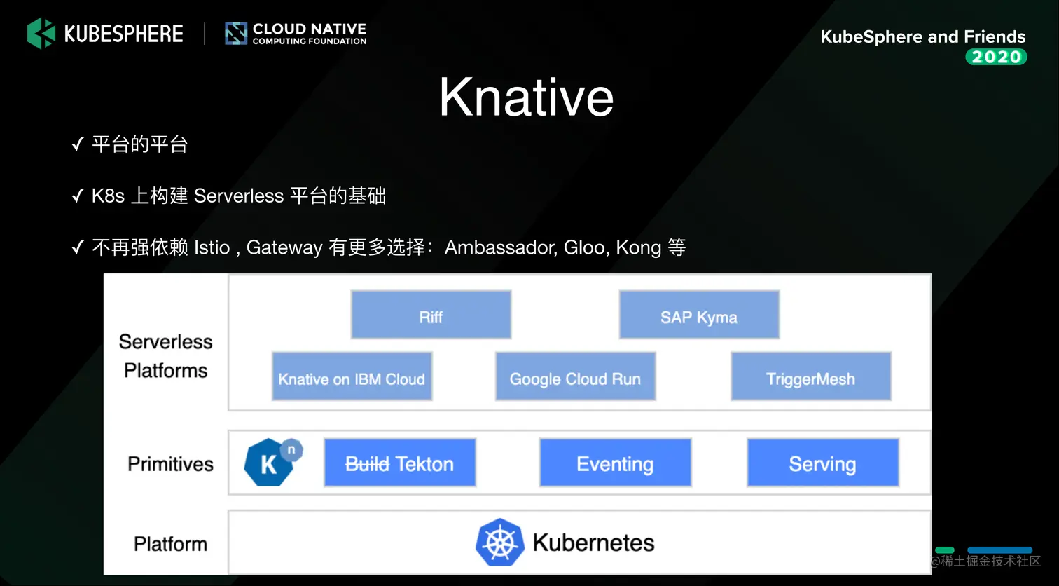 - 之前大家对 Knative 比较诟病的地方,就是它比较重,因为它依赖于Istio。Knative 自身的安装,可能也就几十兆,但是装上 Istio 之后,会占用几 g 内存。然而目前它已经不再强依赖于 Istio 了,Istio 只是其中一个选项。你也可以使用别的组件,比如 ambassador、Gloo、Kong 去替代它做 API Gateway。这意味着 Knative 也在逐渐的轻量化。