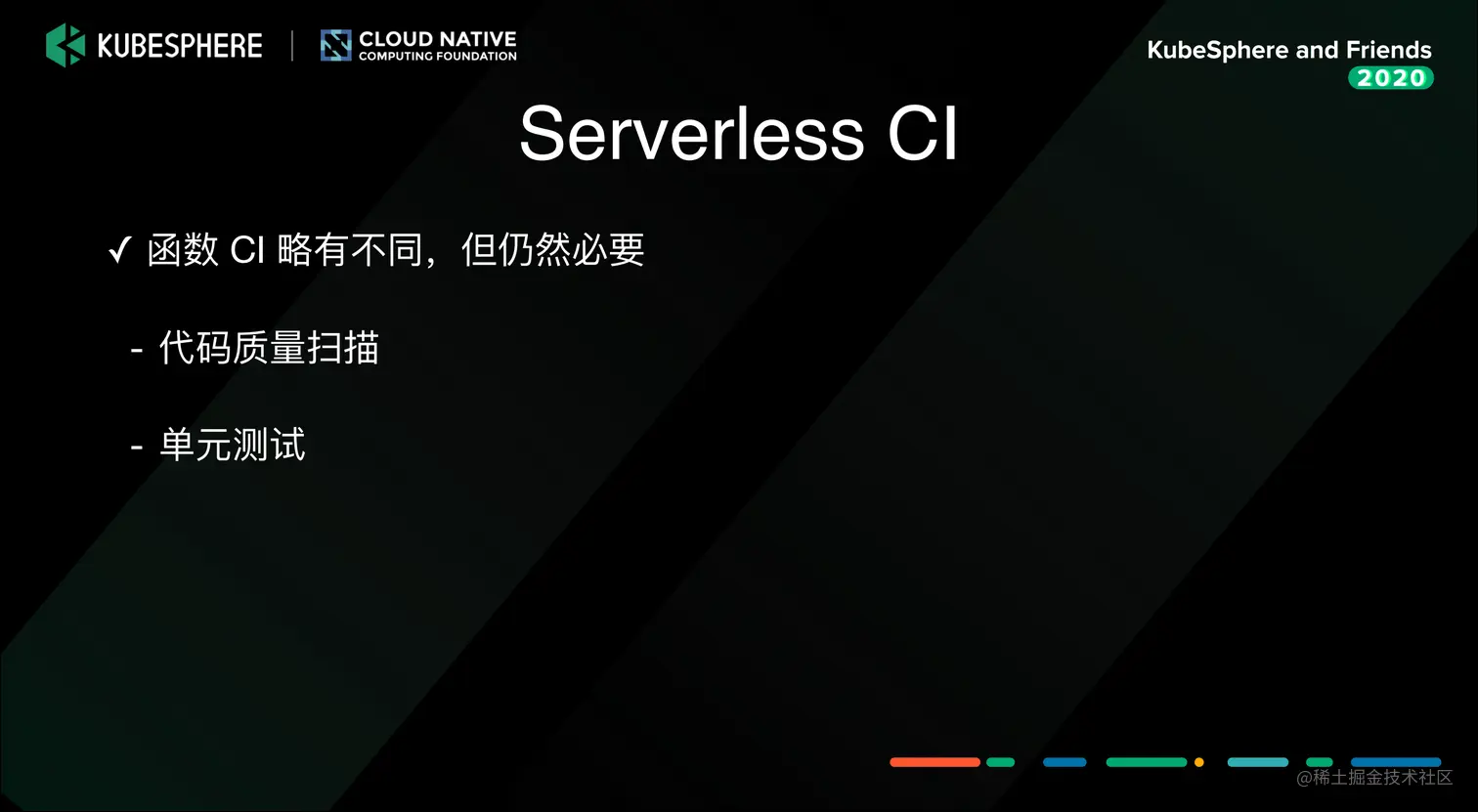 Serverless 的 CI 也是需要的,但是因为它是函数,不是一个完整的 source code,所以它有一些不一样的地方。但是肯定也需要代码的质量扫描、单元测试这样的工作。