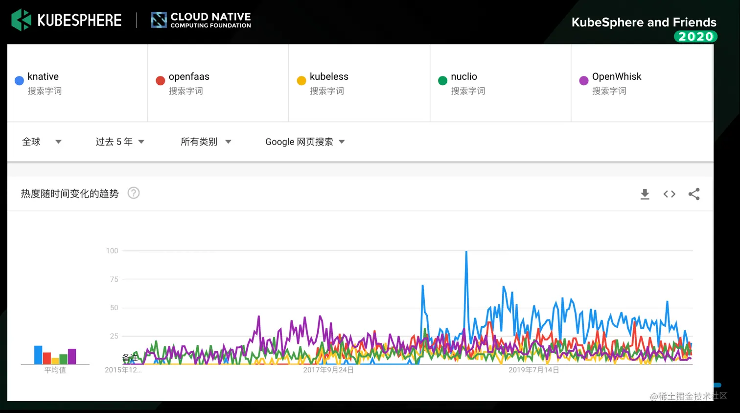 下图是在 Google trend 上查询到的数据。在过去一年中, Knative 的热度基本是最高的,OpenFaaS 的热度在 FaaS 平台中是比较靠前的。而过去 5 年的数据也类似,可以说,Knative 自问世以来,热度一直居高不下。