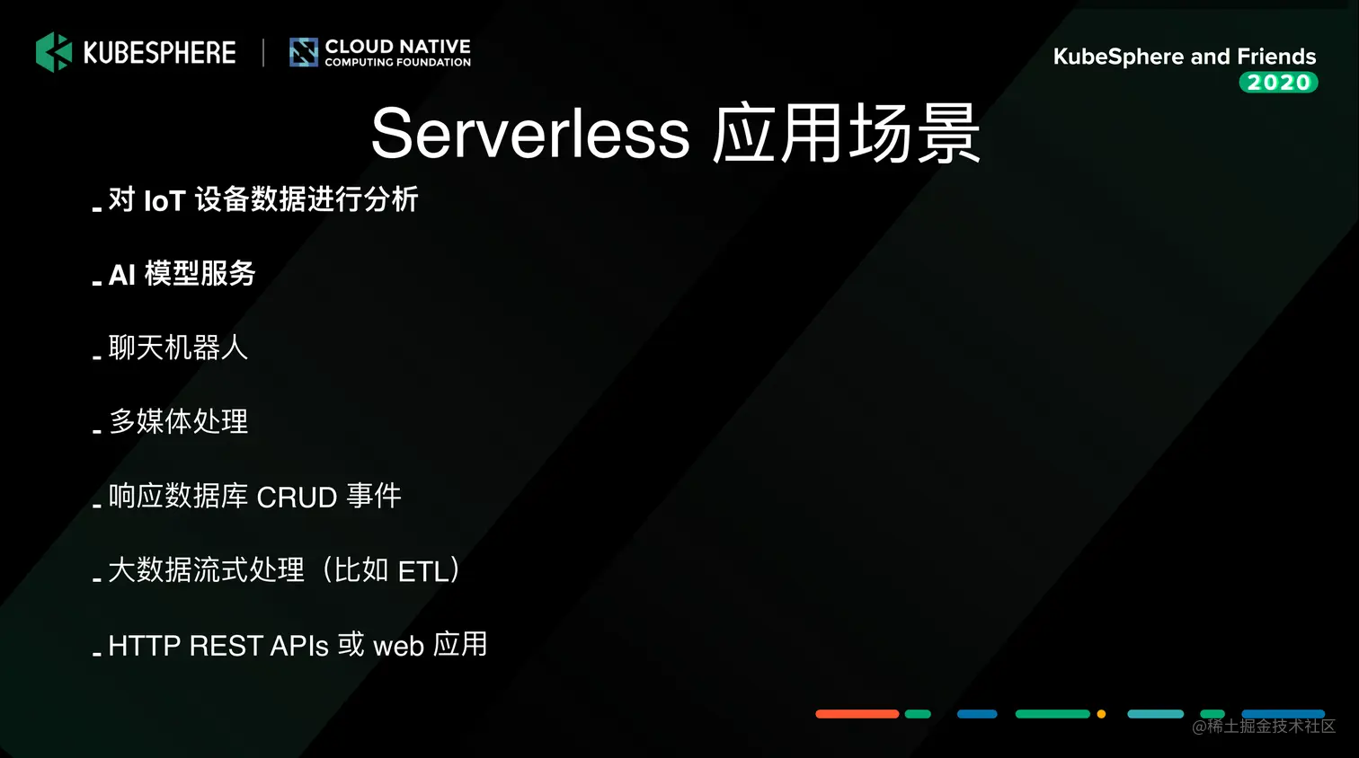 AI 也在逐渐兴起。边缘或者是云端提供模型的服务,因为很多模型的推理都要占用 GPU,所以如果一直占用 instance,非常耗费资源,而且还增加了成本。但是如果用 Serverless 这种方式去提供服务,比如利用 Kubeflow 项目下的 KFServing 提供推理服务,在空闲的时候可以 scale 到 0,有流量的时候会自动 scale up 起来,所以能很好地节省成本。