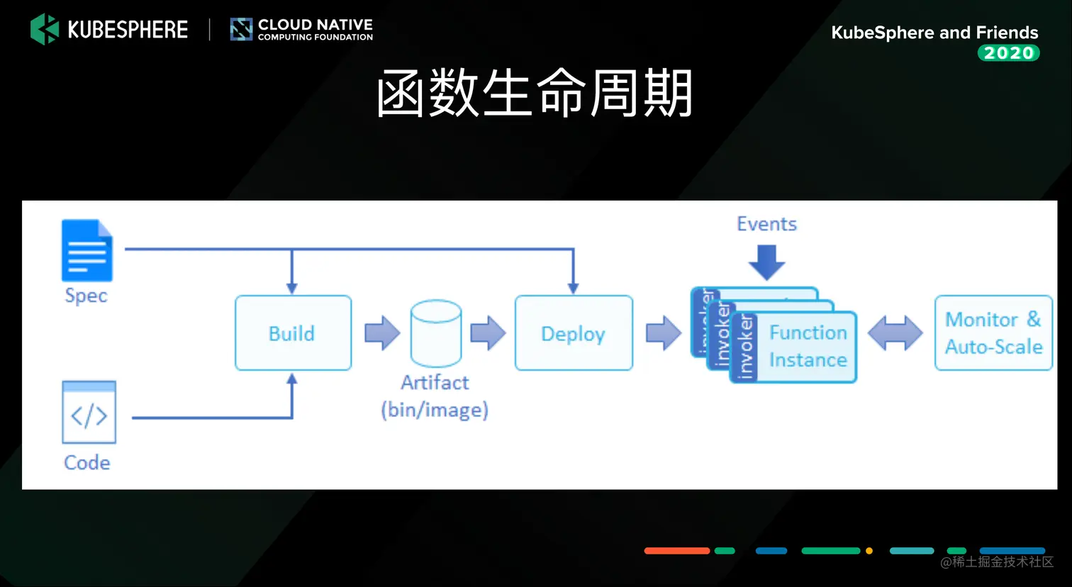 函数(function)是有生命周期的,也就是函数部署流水线的流程。首先提供 function 的源码和 spec,然后把源码 build 成 docker image,再把 docker image 部署到 FaaS 平台上。