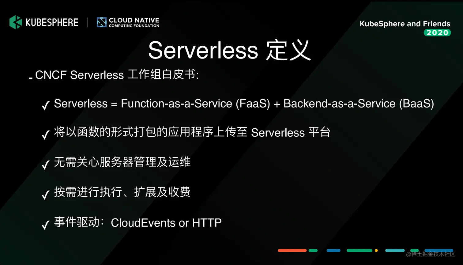 CNCF 有一个 Serverless 工作组,在 Serverless 的白皮书中进行了定义。简单来讲就是,Serverless 等于 FaaS(Function-as-a-Service) 加上 BaaS(Backend-as-a-Service)。我们可以将应用程序以函数的形式打包,然后上传到 FaaS 平台。这样我们就不用关心底层服务器的运维,因为它能自动扩展,而且是按需收费。