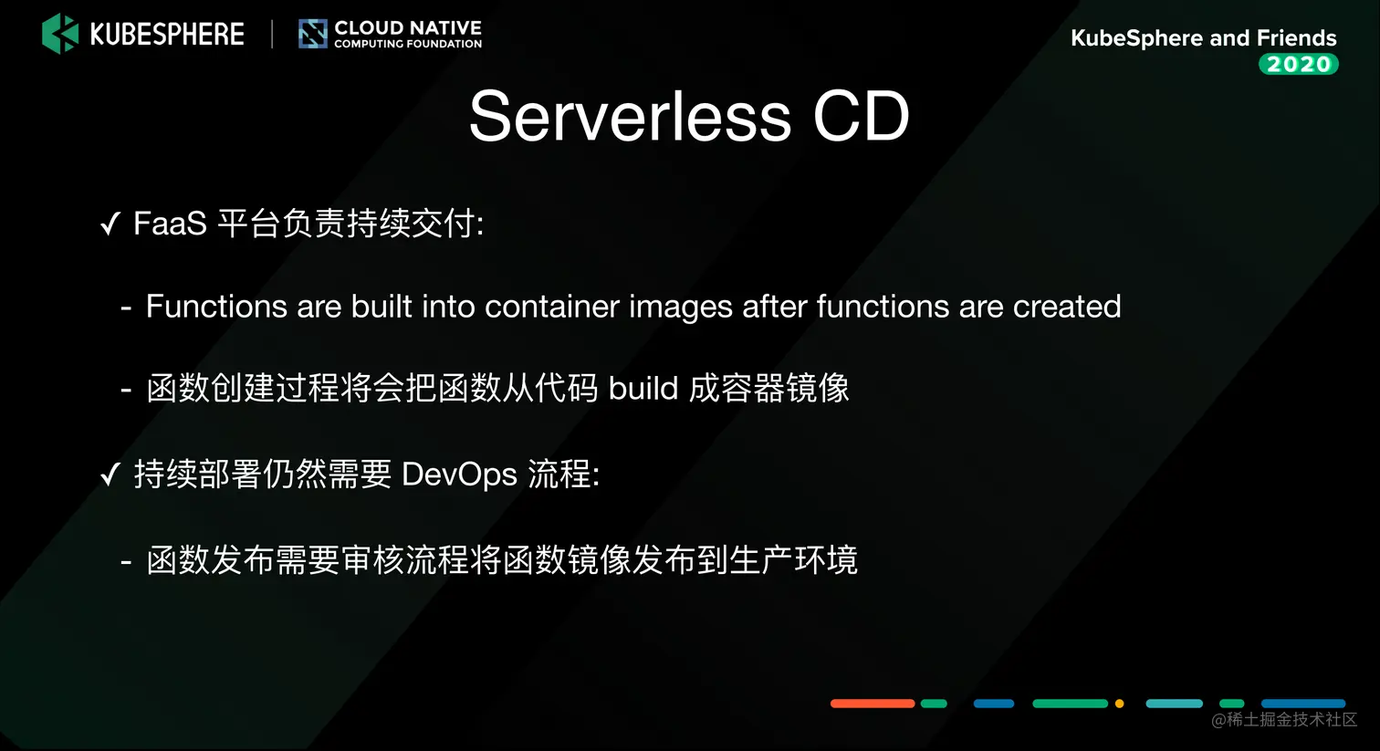 函数要 build 成镜像会有一个 build 的过程,那么在 devops 里这个过程就是持续交付。然后把镜像部署到生产环境,在 devops 里面这个过程就是持续部署,所以 Serverless 和 DevOps 也有很多结合点。