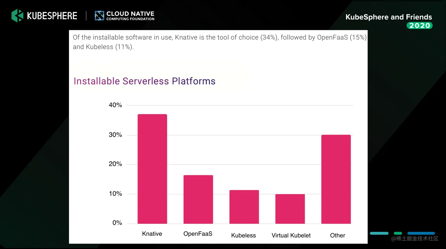 下图是 CNCF 去年做的一个调查,调查显示,在可安装的 Serverless 平台里,Knative 是比较领先的,然后 OpenFaaS 在 FaaS 平台里是比较领先的。