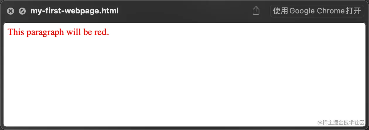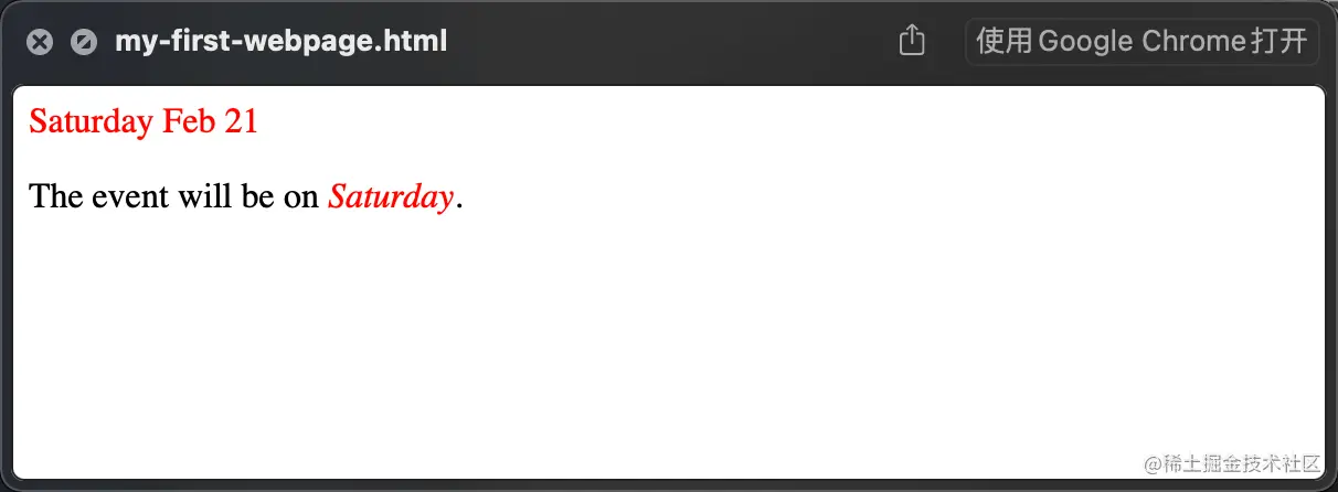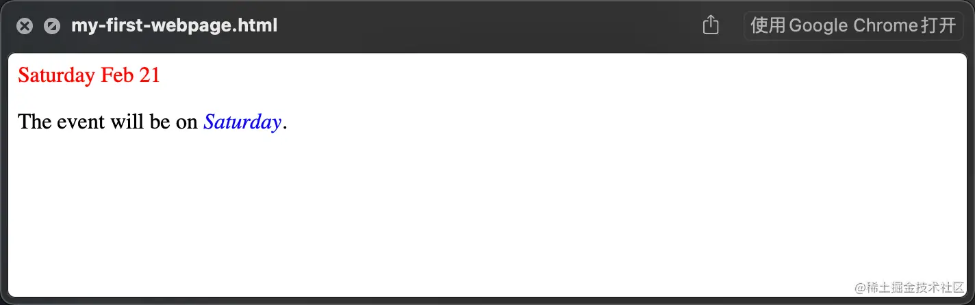将文件另存为 my-first-webpage.html ,然后使用浏览器将其打开,您就会看到: