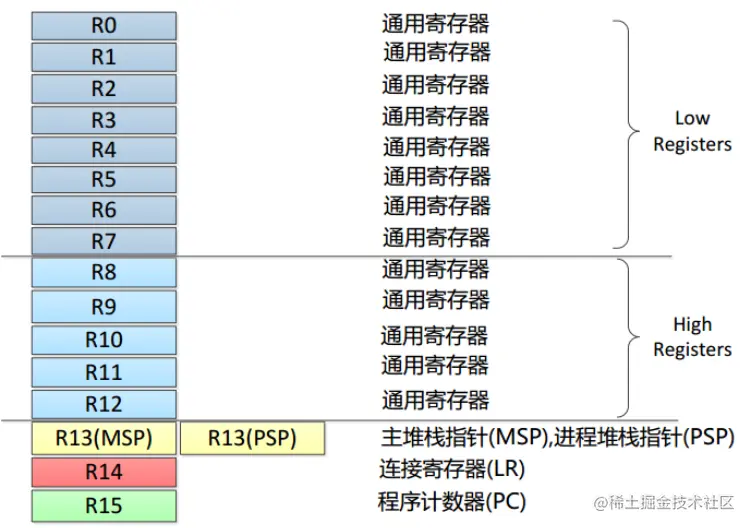 - 注意:并不是每个应用都需要两个堆栈指针,简单的应用程序只需要MSP即可