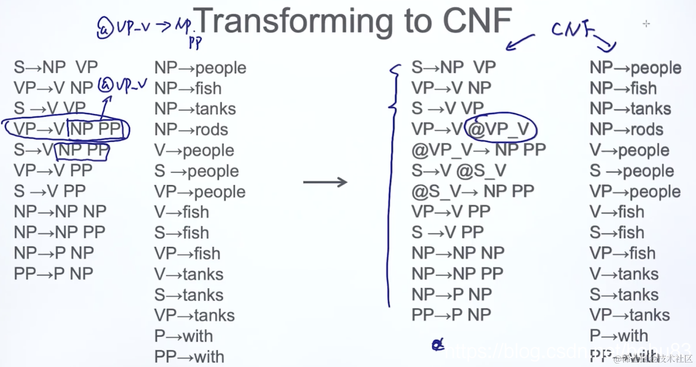 三值规则处理,把其中两个值合并,形成新的值,截图的VP→V NP PP,把后面两个NP PP合并起来,并起名:@VP_V,并加入规则:@VP_V→NP PP