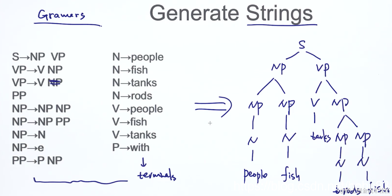 假设有4个 单词,fish,people,fish,thanks,自下(叶子节点)往上(根)填充一棵语法树。