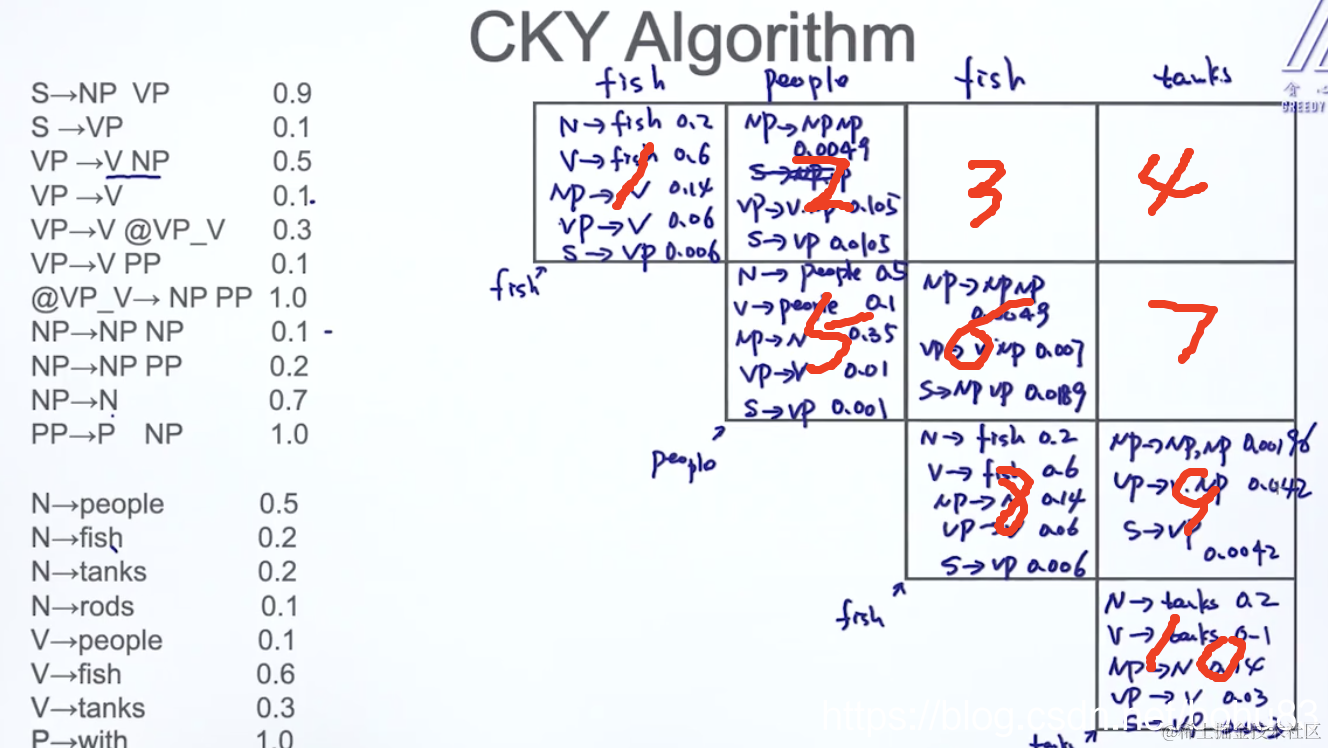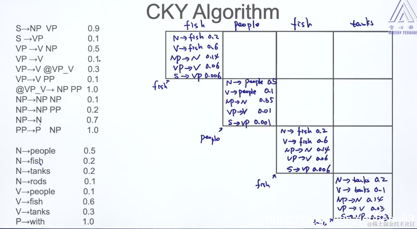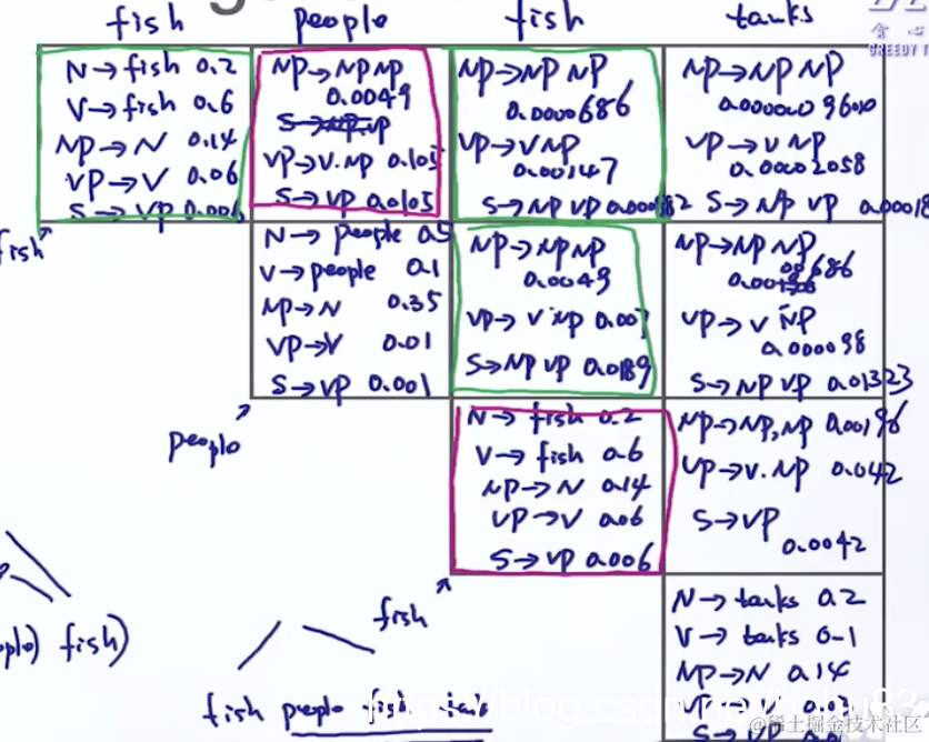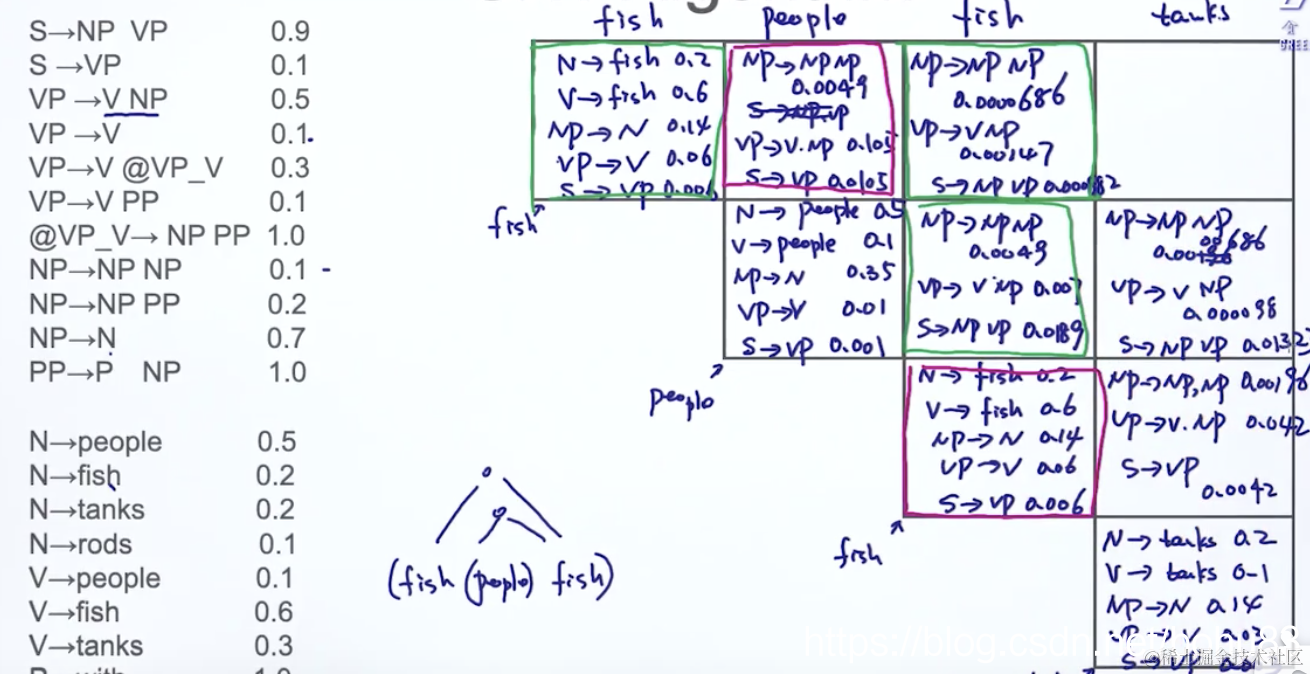 VP→V NP=(V NP)× (V→这个是fish格子)×(NP→N这个是people格子)= 0.5×0.6×0.35=0.105