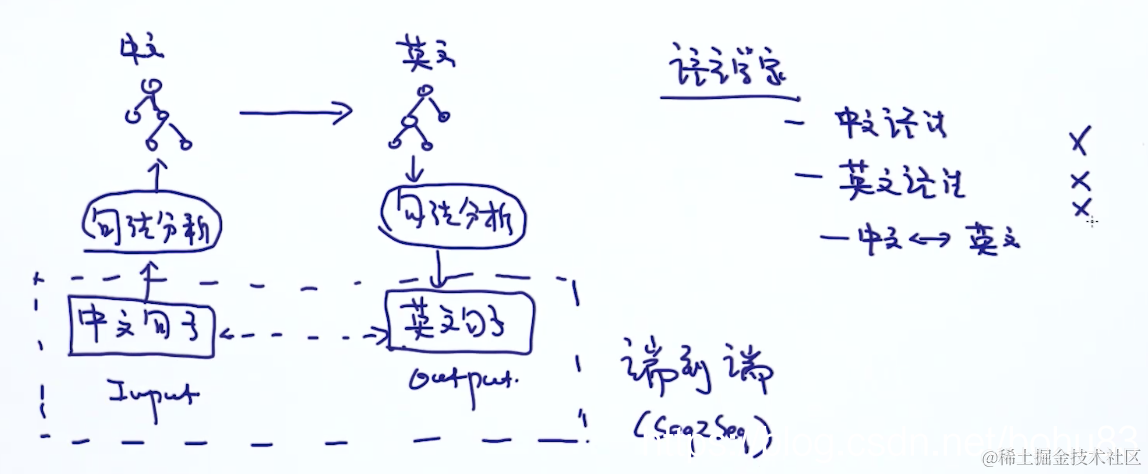 传统的机器翻译需要句法分析、语言学家支持。现在的改进端到端(seq2seq),无需人工干预的翻译: