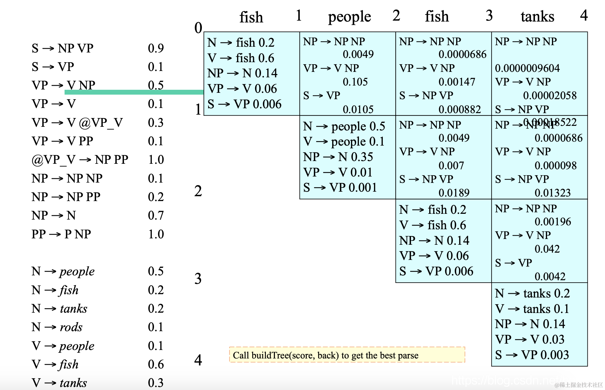 接下来填上一层,以这个位置是fish,people两个词的父结点为例,fish,people各有5种路径。要找两个子节点中同时出现的规则,然后计算概率填入。