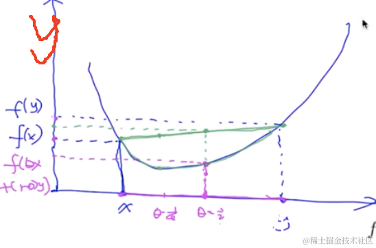 式子的理解:左侧认为是下图的蓝线,右侧是f(x),f(y)两点之间的连线(绿色)蓝色要《=绿色的值