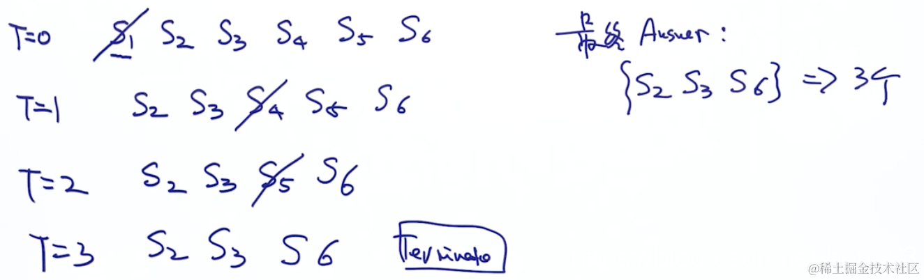 每个时刻都找一个冗余集合并去掉,直到没有冗余集合为止。可以看到不能保证全局最优解