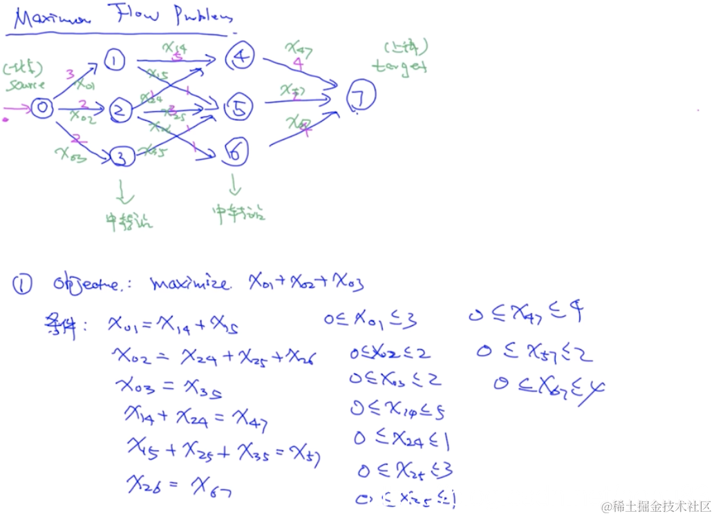 根据题目,目标函数是,下面都是限制条件,本身管道的取值范围,以及管道的流向(输入=输出)。