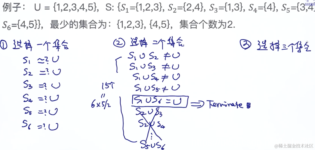 例子: U = {1,2,3,4,5}, S:{S1={1,2,3}.S2={2,4},S3={1,3},S4={4},S5={3,4},S6={4,5}}, 最少的集合为{1,2,3},{4,5}, 集合个数为2