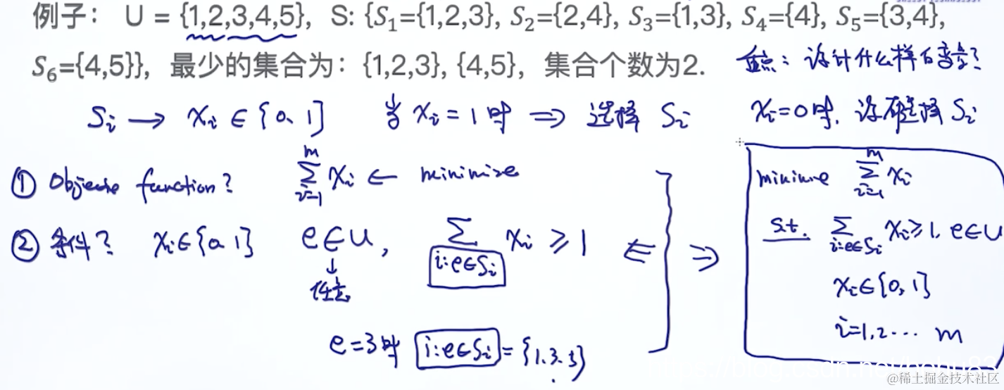 意思是U里面任意一个元素,可以属于多个S,这些S至少要有一个被选中。老师举例是元素3,