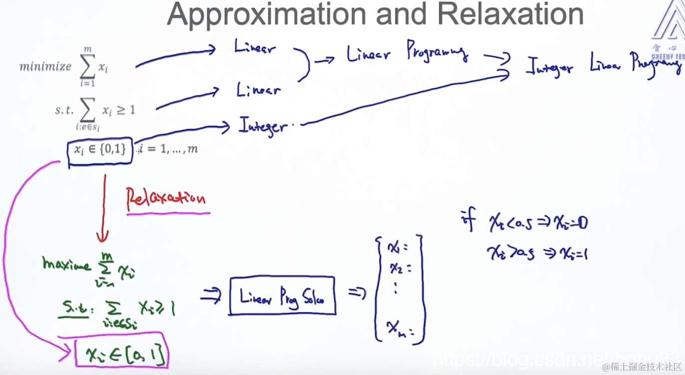 就是下面截图的Relaxation.目标函数不变,只是把第三个条件取值范围从离散的0,1变成了连续的(由discrete转到continuous)。就符合线性条件,可以求解,