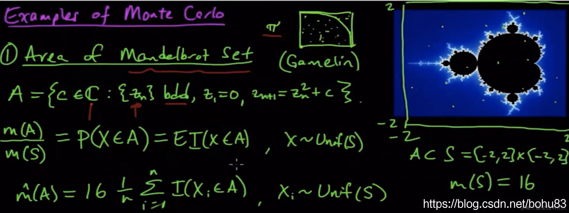 关于蒙特卡洛的经典应用是计算。老师给了**Mandelbrot集合 的例子。**