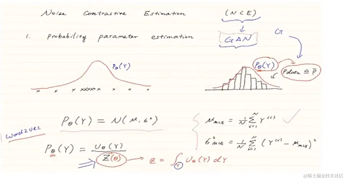 在概率参数估计中使用NCE,相当于是绕过了直接求归一化项这个难题,转而求解一个等效问题的参数估计(用采样方式替换掉原来的归一化常数)。将一个复杂问题转化成一个等价的可计算的简单问题