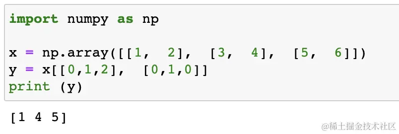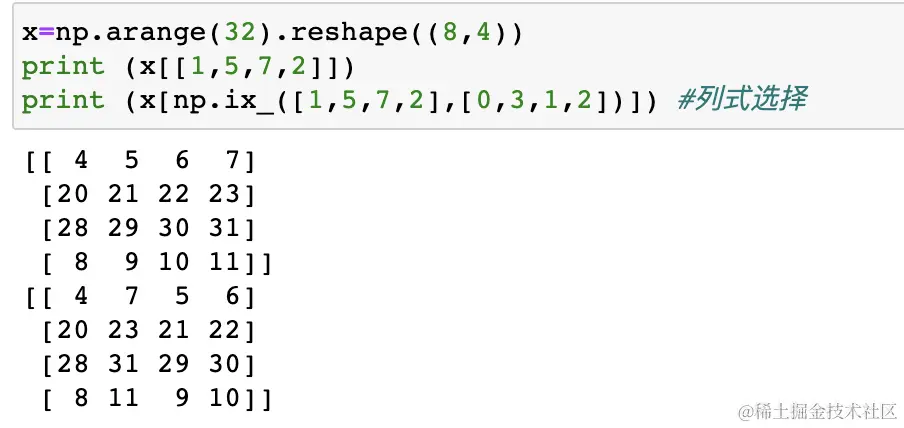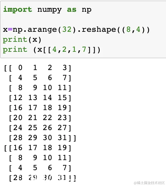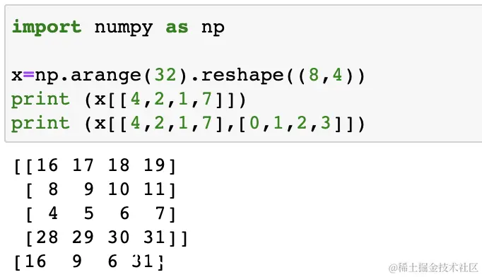 花式索引根据索引数组的值作为目标数组的某个轴的下标来取值。对于使用一维整型数组作为索引,如果目标是一维数组,那么索引的结果就是对应位置的元素;如果目标是二维数组,那么就是对应下标的行。