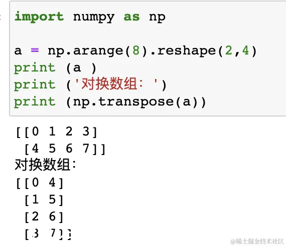 numpy.transpose 函数用于对换数组的维度,格式如下:
