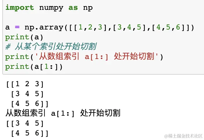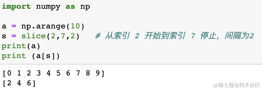 ndarray 数组可以基于 0 - n 的下标进行索引,切片对象可以通过内置的 slice 函数,并设置 start, stop 及 step 参数进行,从原数组中切割出一个新数组。