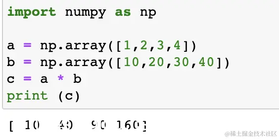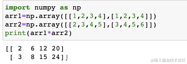 如果两个数组 a 和 b 形状相同,即满足 a.shape == b.shape,那么 a*b 的结果就是 a 与 b 数组对应位相乘。这要求维数相同,且各维度的长度相同。