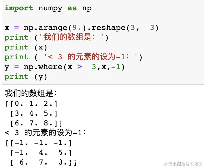 numpy.where() 函数返回输入数组中满足给定条件的元素的索引。