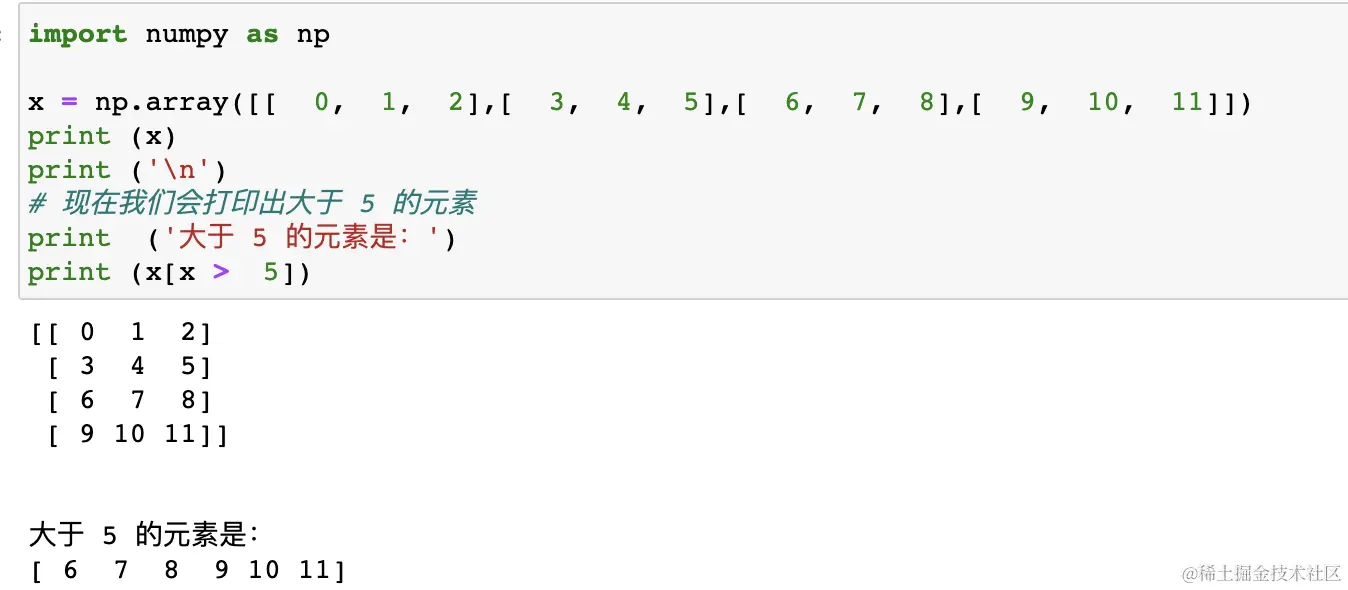 布尔索引通过布尔运算(如:比较运算符)来获取符合指定条件的元素的数组。