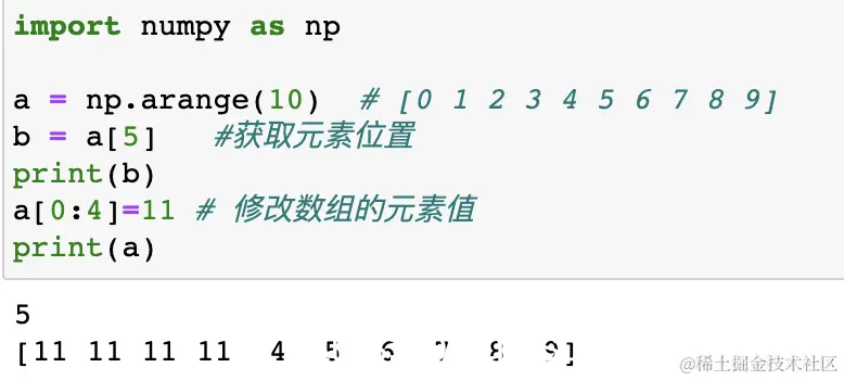 ****ndarray对象的内容可以通过索引或切片来访问和修改,与 Python 中 list 的切片操作一样。
