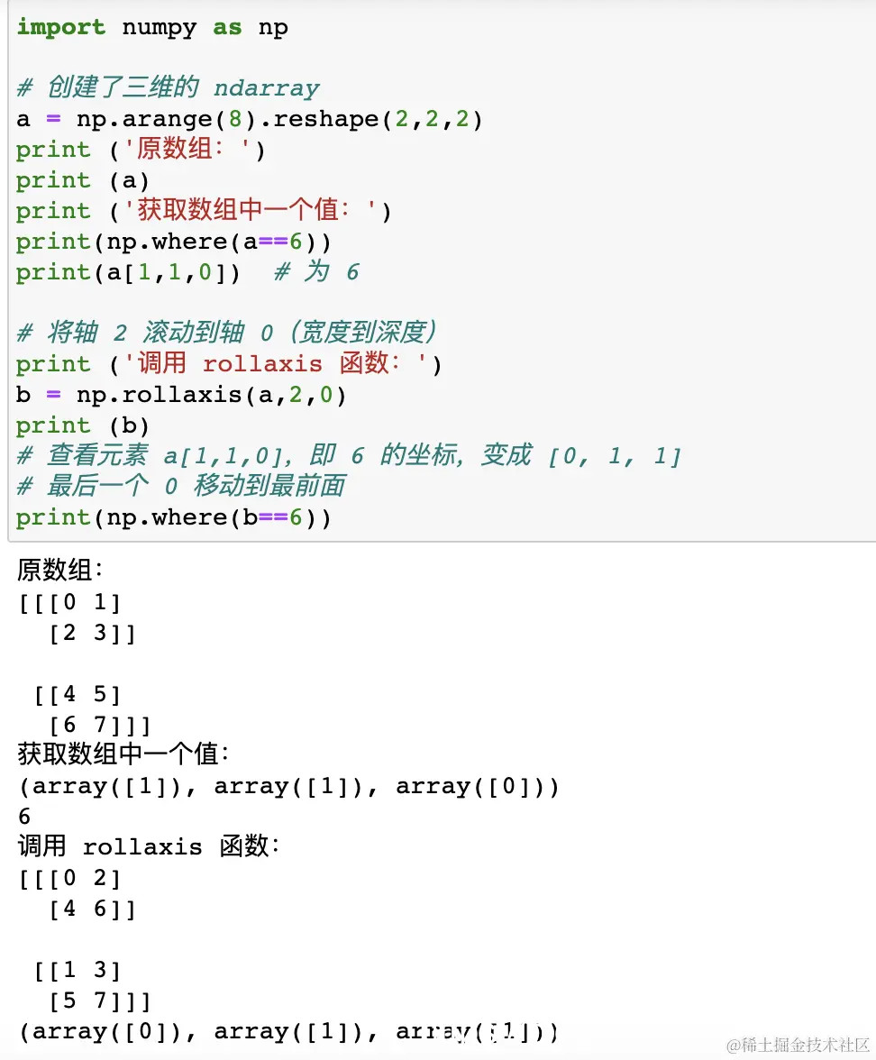 arr:数组axis:要向后滚动的轴,其它轴的相对位置不会改变start:默认为零,表示完整的滚动。会滚动到特定位置。