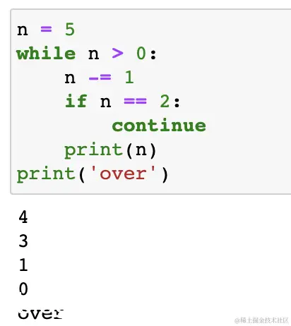 continue 语句被用来告诉 Python 跳过当前循环块中的剩余语句,然后继续进行下一轮循环。