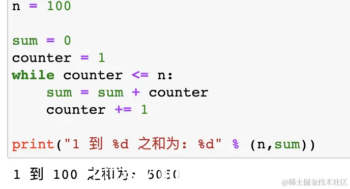以下实例使用了 while 来计算 1 到 100 的总和:
