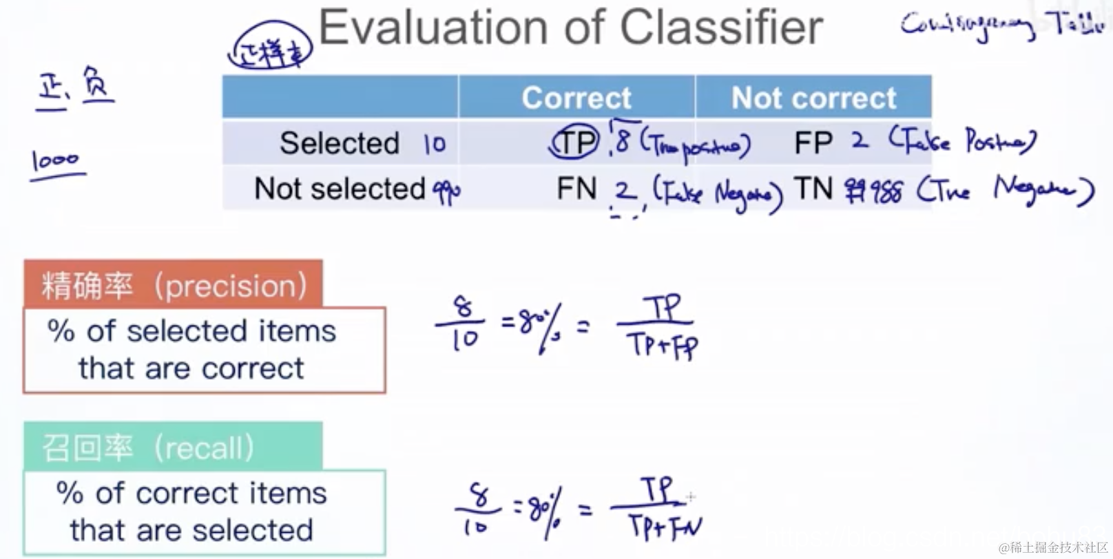 这里,假设1000个人有10个得癌症的,召回了10个,其中真正得癌症的有8个。