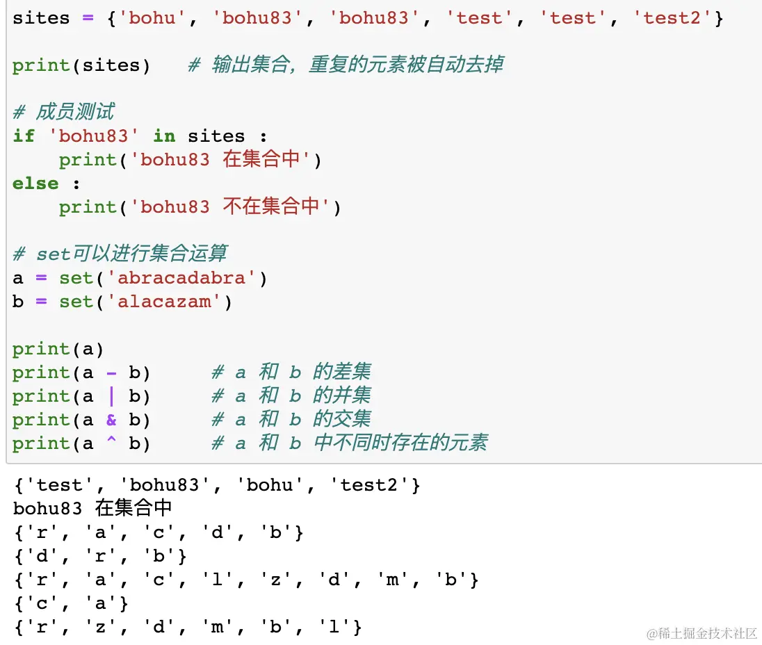 可以使用大括号 { } 或者 set() 函数创建集合,注意:创建一个空集合必须用 set() 而不是 { },因为 { } 是用来创建一个空字典。