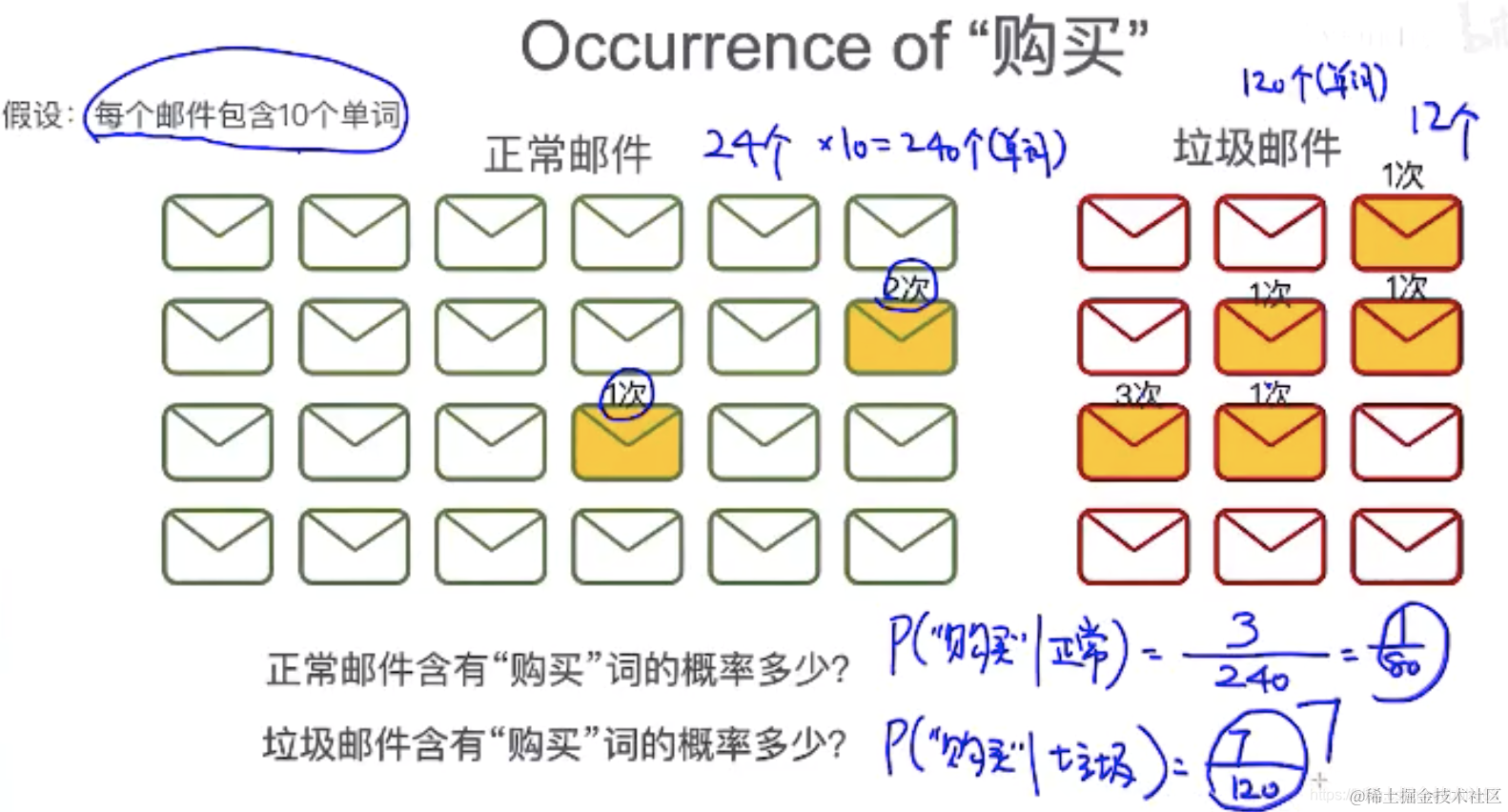垃圾邮件含有“购买”词的概率多少?p(“购买”|垃圾)=7/120