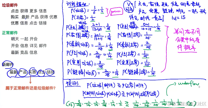 其中p(正常),p(垃圾)是先验概率,剩余的把上一步的单词的概率放入。计算结果就是要比较结果的大小,这个明显左侧大说明该邮件是垃圾邮件。