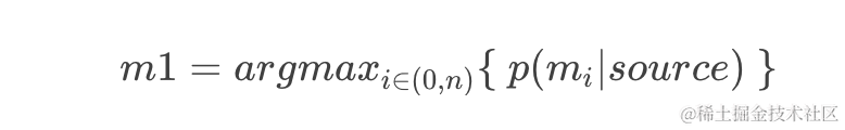 假设用户想传递的信息是m1 经过有噪声信道传递之后接受到的数据source .并且m1到mn是语料库。必有如下等式成立