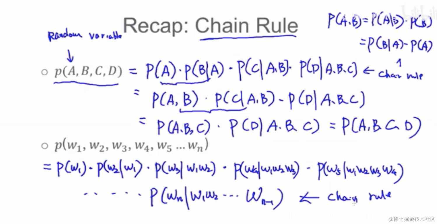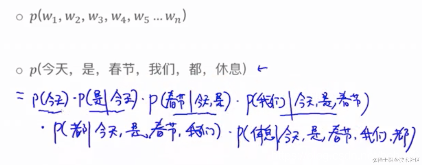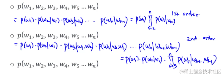 提前都计算好每个单词的概率,这样计算句子的概率就是把这些概率相乘。(就是语言模型训练好之后,遇到新的句子就可以计算)。