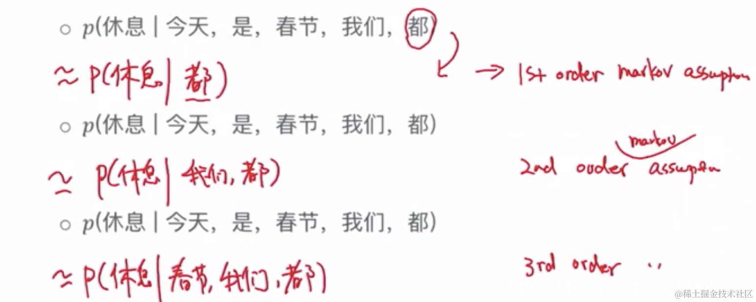 即假设当前词出现的概率只依赖于前 n 个词,可以得到