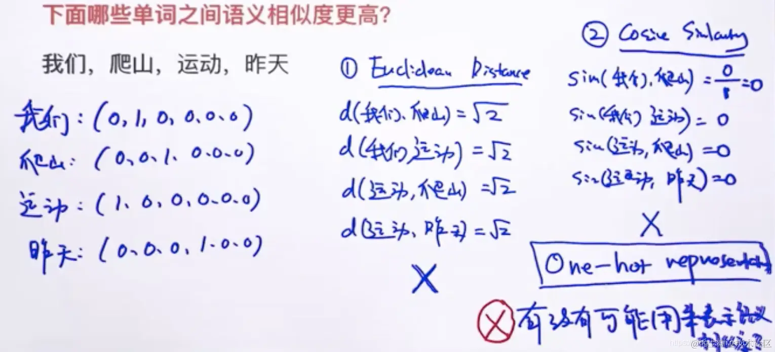 不能表示单词直接的相似度,欧氏距离,余弦相似度都不行。